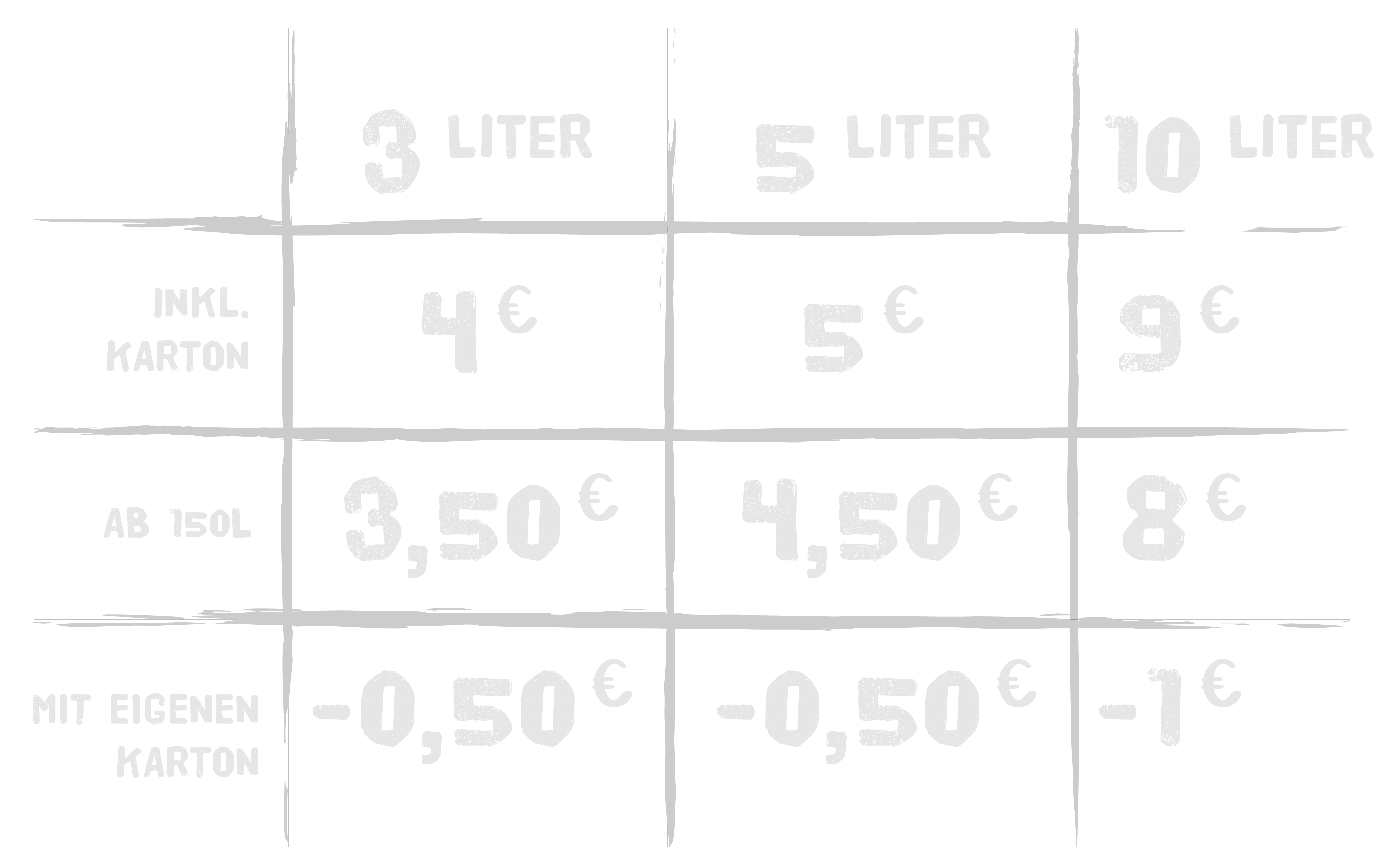 Alle Preise inkl. MwSt und Verpackung. Wenn Sie Ihren eigenen Karton mitbringen, sparen Sie 0,50€ / 1€ pro Gebinde.